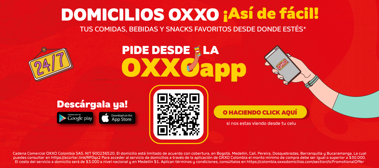CADENA COMERCIAL OXXO COLOMBIA S.A.S., compañía constituida en Colombia y domiciliada en la ciudad de Bogotá Av. Cra 19 #89-21, identificada con NIT 900236520-7. Al continuar más allá de esta página, acepta nuestros Términos de servicio, Política de cookies, Política de privacidad y Políticas de contenido. Todas las marcas comerciales son propiedad de sus respectivos dueños. © OXXO™ Ltd. Todos los derechos reservados.